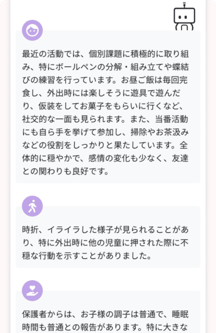 急な面談などで記録を見返さないといけない時にとても助かります。療育記録をAI分析していることを事業所の強みや特徴として保護者さまへお伝えすることもできますね。相談事業所との打ち合わせなどにも活用できる内容でボタン1つで簡単に使えるのが良いです。