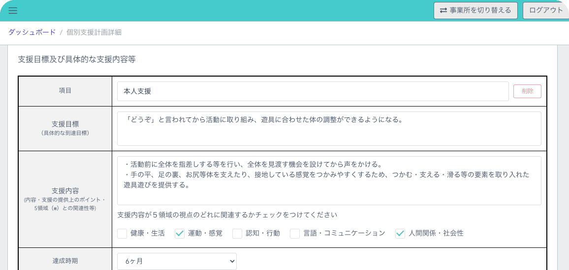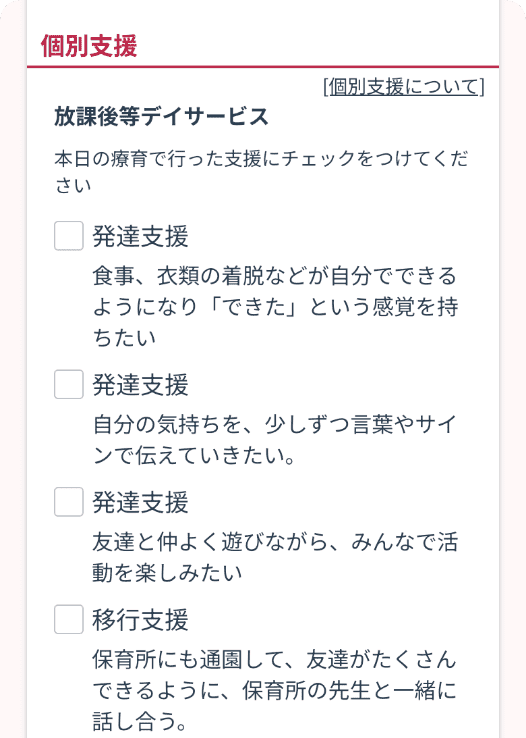 開所からデイロボを導入していて、業務効率がとても良いと感じています。報酬改定では加算なども大きく変わり手こずりましたが、5領域対応の個別支援計画書にスムーズに移行できました。支援項目で対応する5領域をチェックする形はシンプルで保護者にも説明しやすく、LINEで見てもらえてサインがもらえるのも便利です。放デイを運営している知人にもぜひ紹介したいと思っています。